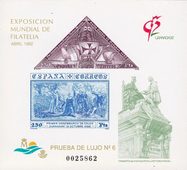 Así mismo, dentro de los actos que se desarrollaron con motivo del V Centenario del Descubrimiento de América, se llevó a cabo en Granada, entre los días 24 de abril al 3 de mayo, la Exposición Mundial de Filatelia. Con este motivo, Correos puso en circulación una hoja conmemorativa en la que junto al logotipo de la exposición y un fragmento del Monumento a las Capitulaciones firmadas por Colón y los Reyes Católicos que se encuentra en Granada, reproduce los sellos de 1 peseta con “la flota de Colón” de José López Sánchez Toda y el de 10 pesetas con el “Primer desembarco de Colón”, obra de Camilo Delhom, ambos con valor de 250 pesetas, en calcografía y offset, bajo diseño de Mariano Salamanca.