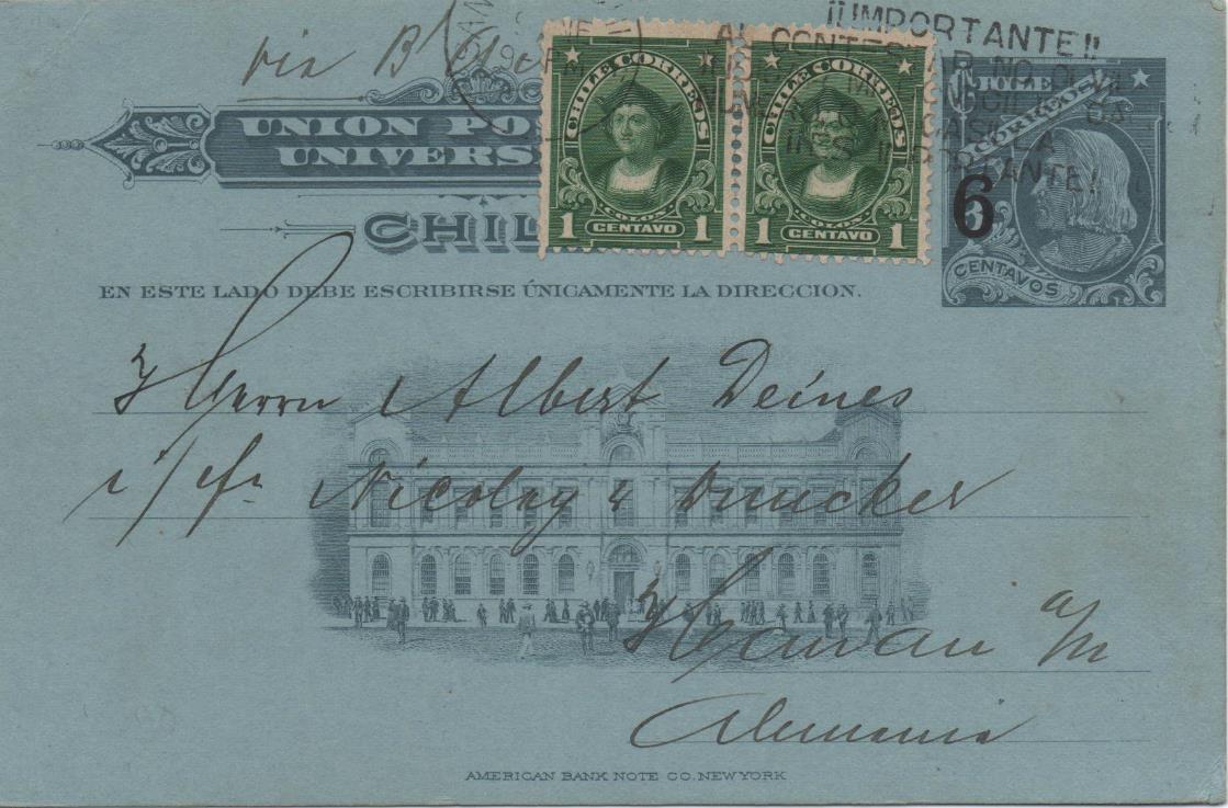 Tarjeta de 1904 con sobrecarga de 6 centavos con franqueo adicional de 2 centavos con dos sellos de Colón de la emisión de 1915, para completar la tarifa de 8 centavos.