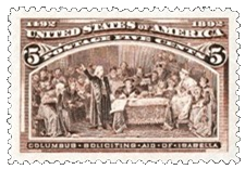 Esos 16 sellos forman la historia completa de Colón y de su obra: tierra a la vista, desembarco, la carabela «Santa María», la escuadrilla en pleno Océano, llegada de Colón a Barcelona, en la Rábida exponiendo sus proyectos, presentación de los indígenas y de los extraños productos recogidos en lejanas tierras, Colón encadenado …, y, por último, retratos de la gloriosa Reina doña Isabel la Católica, y de Colón en el modo como nos es familiar, esto es, afeitado, con la cabeza descubierta, con larga cabellera hasta el cuello, como ‘se ve en el cuadro que existe en el Ministerio de Marina, de Madrid. Y en esa serie se inmortalizan además lienzos célebres de pintores españoles, como el de Ricardo Balaca, «Colón recibido por los Reyes Católicos al regreso de su primer viaje», que figura en el sello de 15 céntimos, y el de Muñoz Degrain, «Isabel la Católica cediendo sus joyas para el descubrimiento», que ostenta el de un dólar.