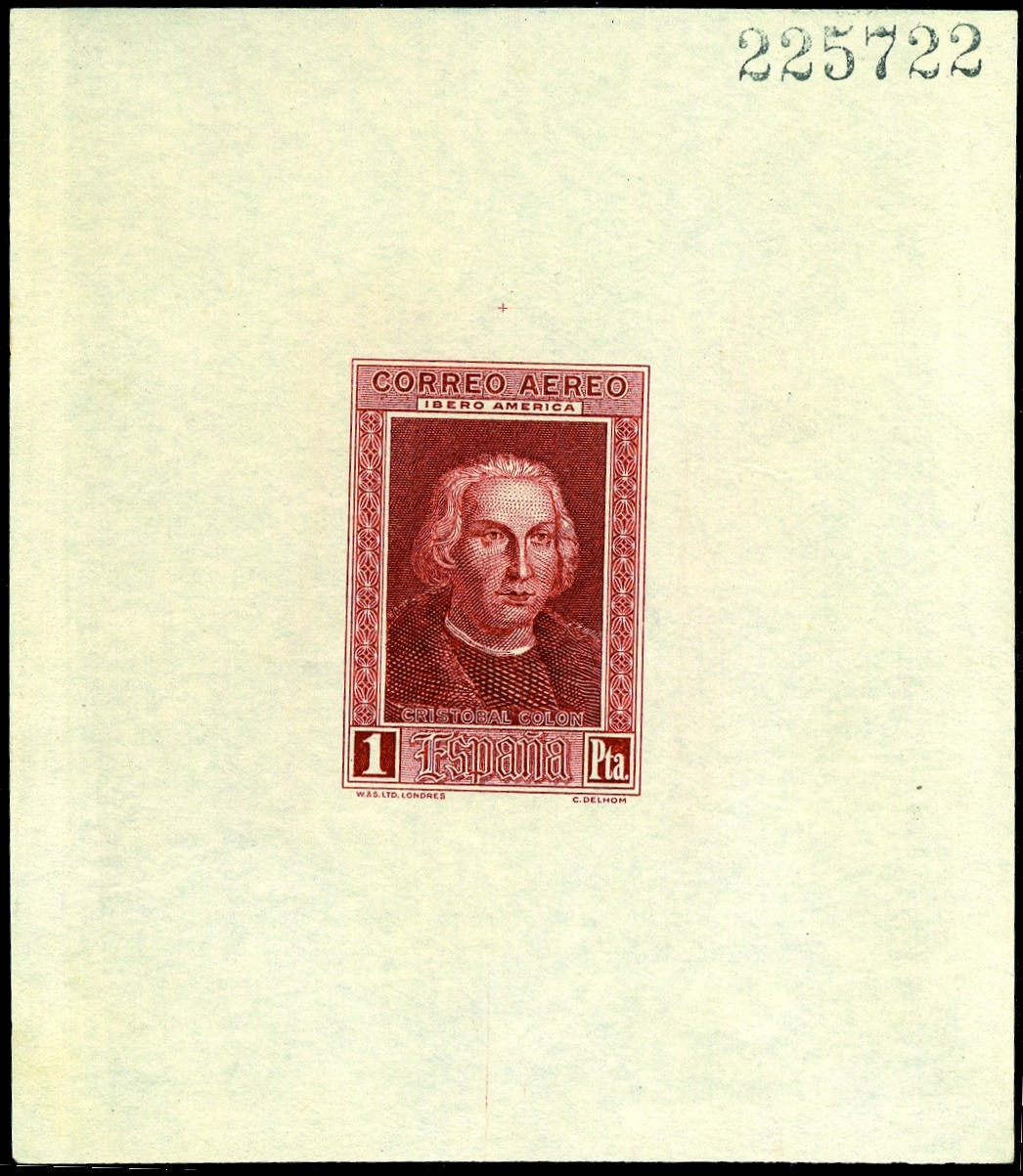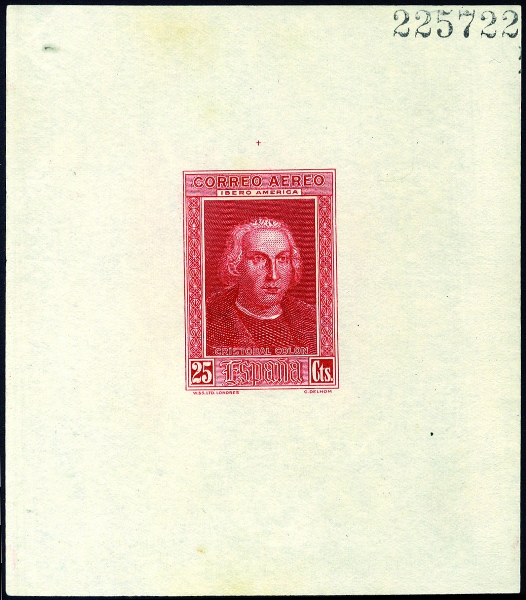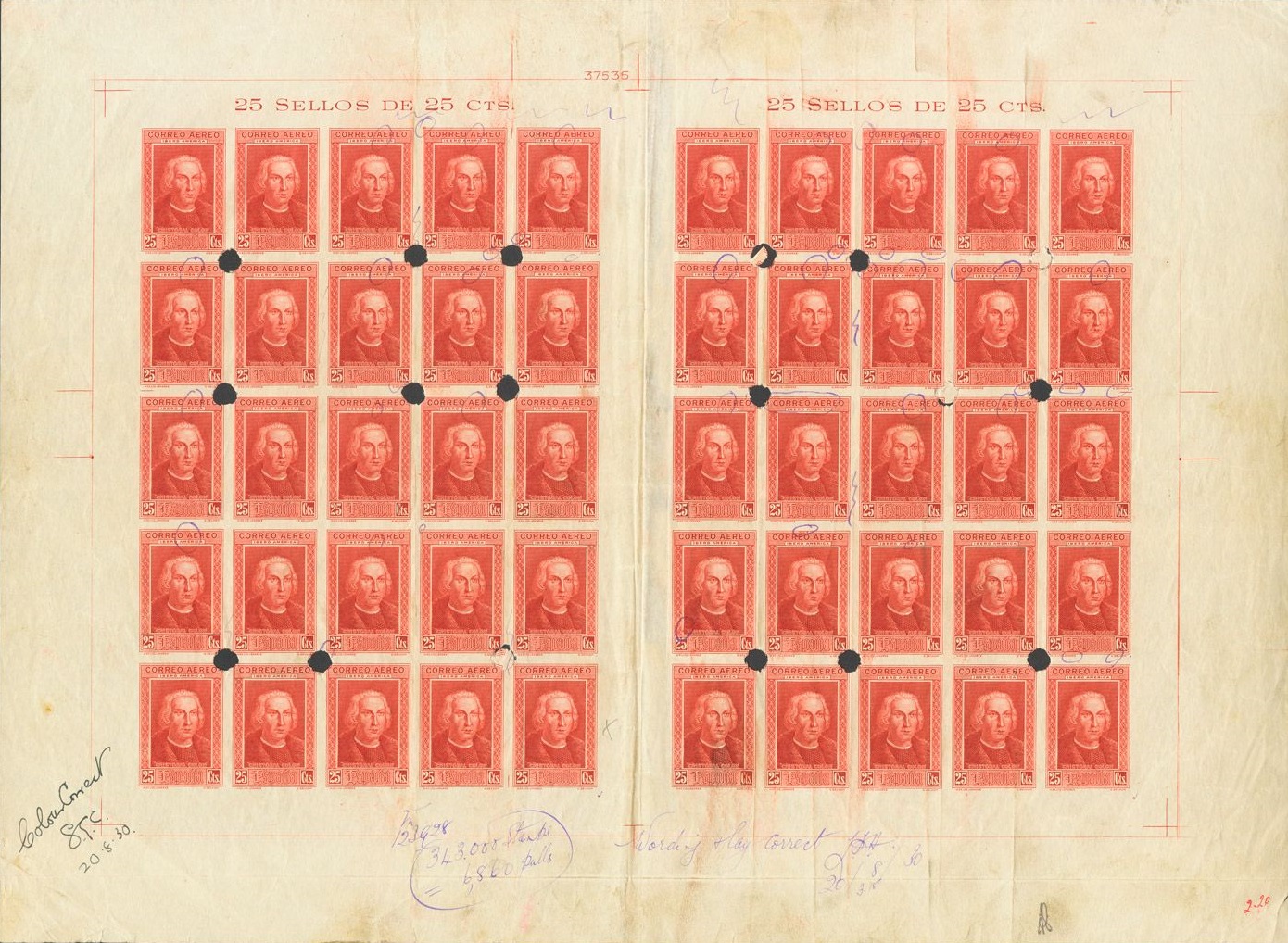 Pliego completo con un taladro en cada sello del valor de 25 céntimos, con indicación «Color Correct», la fecha 20.8.30 y el número de ejemplares (343.000 steps). Archivo Waterlow