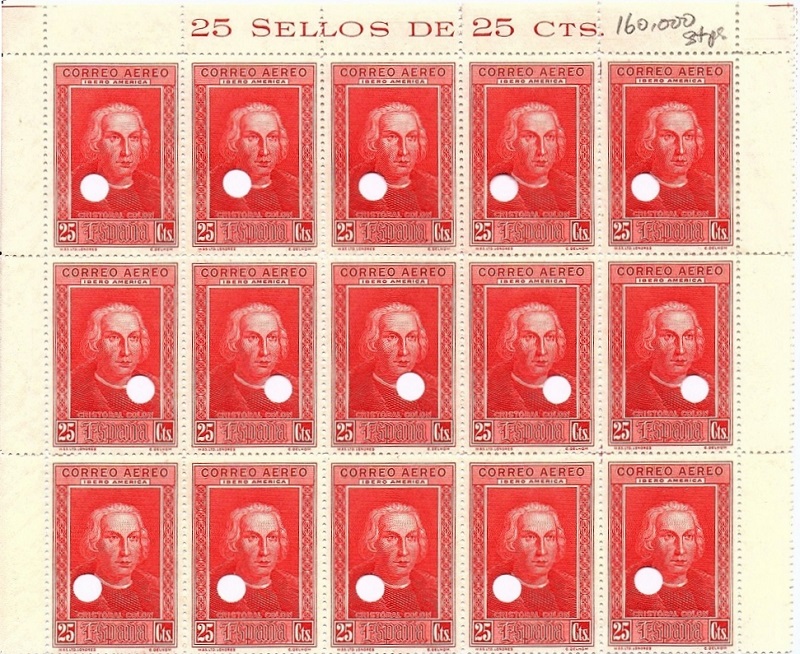 - Taladros angulares, circulares, bien definidos, de unos nueve u once milímetros de diámetro, realizado en el centro de cada bloque de cuatro efectos, perfora la esquina del sello, pueden llegar a aparecer en las cuatro esquinas aunque lo normal es que solo perforen una o dos esquinas del sello.
