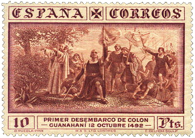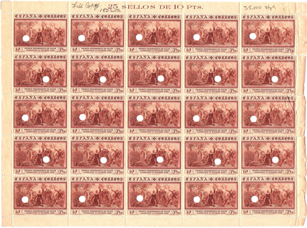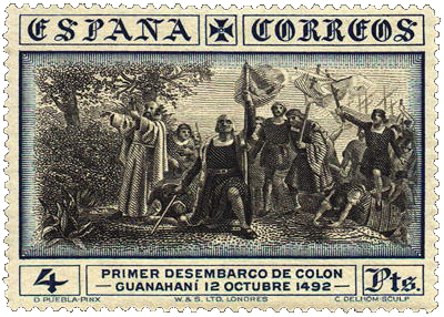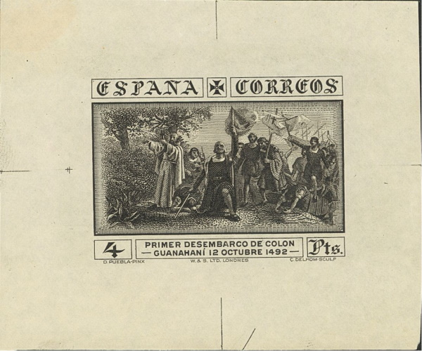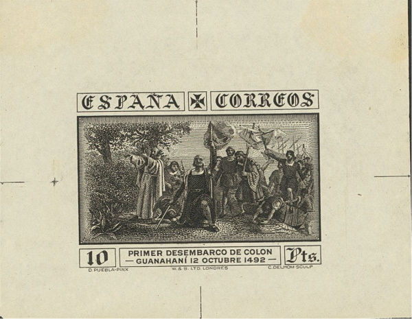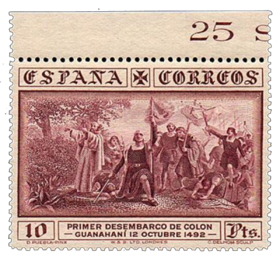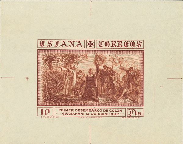 Los sellos de 4 y 10 pesetas correspondientes al correo ordinario, fueron impresos en calcografía. En el recuadro central, abajo en dos líneas, el texto: «Primer desembarco de Colón» y «Guanahaní 12 Octubre 1492″. Como motivo central, se adoptó un grabado de Camilo Delhom; realizado a partir del cuadro conocido como ‘Primer desembarco de Colón en el Nuevo Mundo’ obra de Dióscoro Teófilo Puebla Tolín, premiado con primera medalla en la Exposición Nacional de 1862 y propiedad del Museo del Prado. Actualmente depositado en el Ayuntamiento de La Coruña.