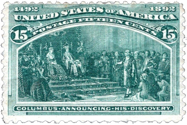 Esta imagen, que finalmente no se adoptó en las emisiones impresas por Waterlow & Sons, ya había sido utilizada con anterioridad en el sello de 15 centavos de la bellísima serie conmemorativa puesta en circulación por los Estados Unidos en 1893 con motivo del Cuarto Centenario del Descubrimiento de América.