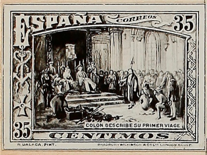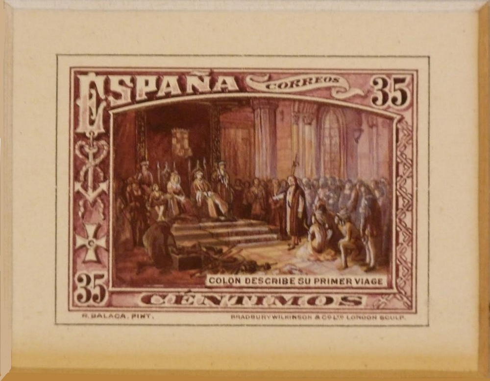 Especialmente interesante resulta el boceto del sello de 35 centavos (nominal que no se utilizaría posteriormente en ninguna de las tres series emitidas con motivo de la Exposición Iberoamericana de Sevilla), que muestra un detalle del cuadro “Colón describe su primer viaje”, obra del pintor Ricardo Balaca (Lisboa, 1844 – Madrid, 1880).